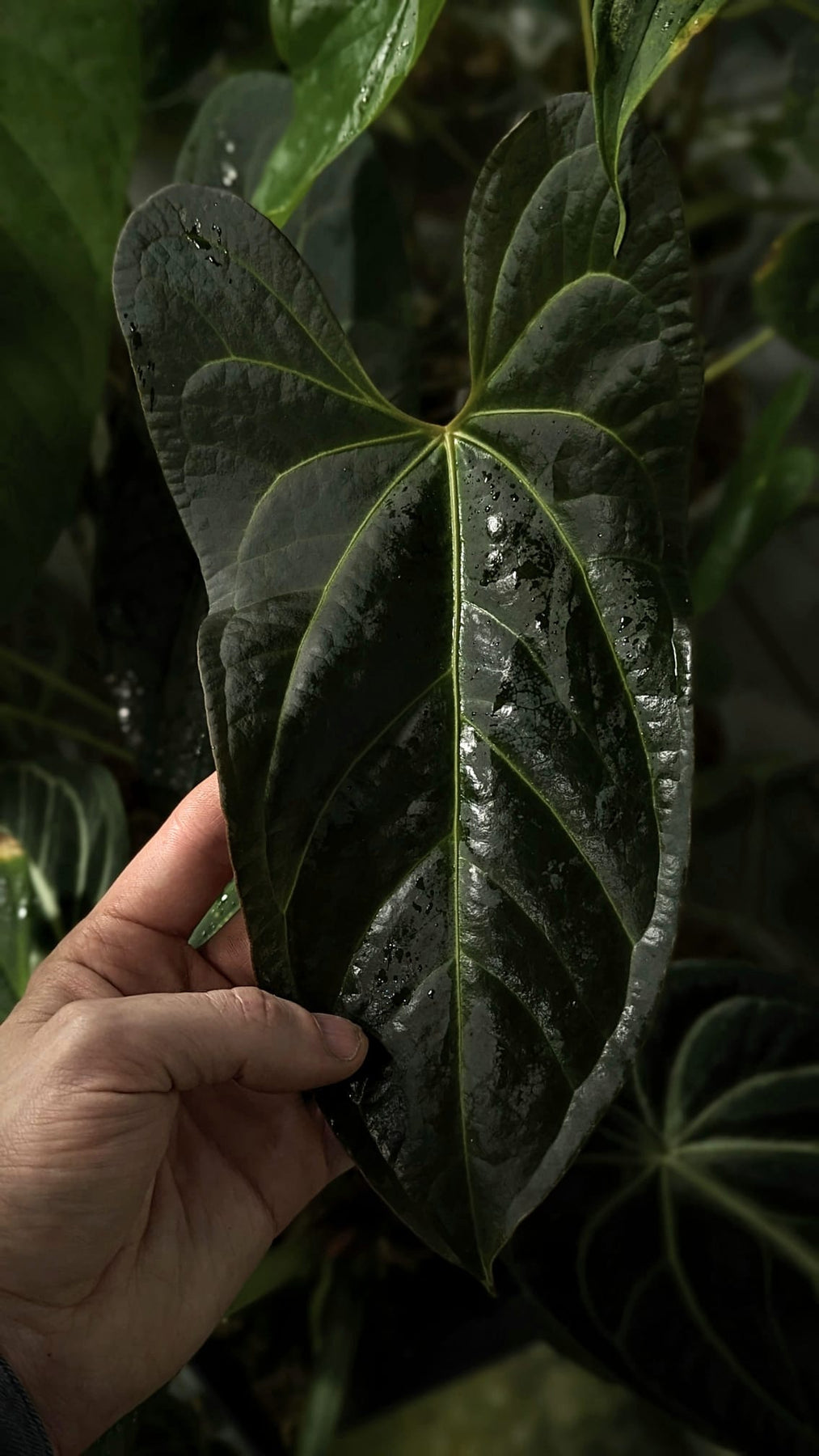 Anthurium 'Donnie Darko' is a plant we acquired and subsequently named, found as a one-off in an Ecuadorian nursery by a friend of ours. They whatsapped me a picture and I bought it on the spot. We don't know the origin or parents, so we gave it the dark 'Donnie Darko' because its dark foliage and ears remind us of the cover art for the film of the same name.
