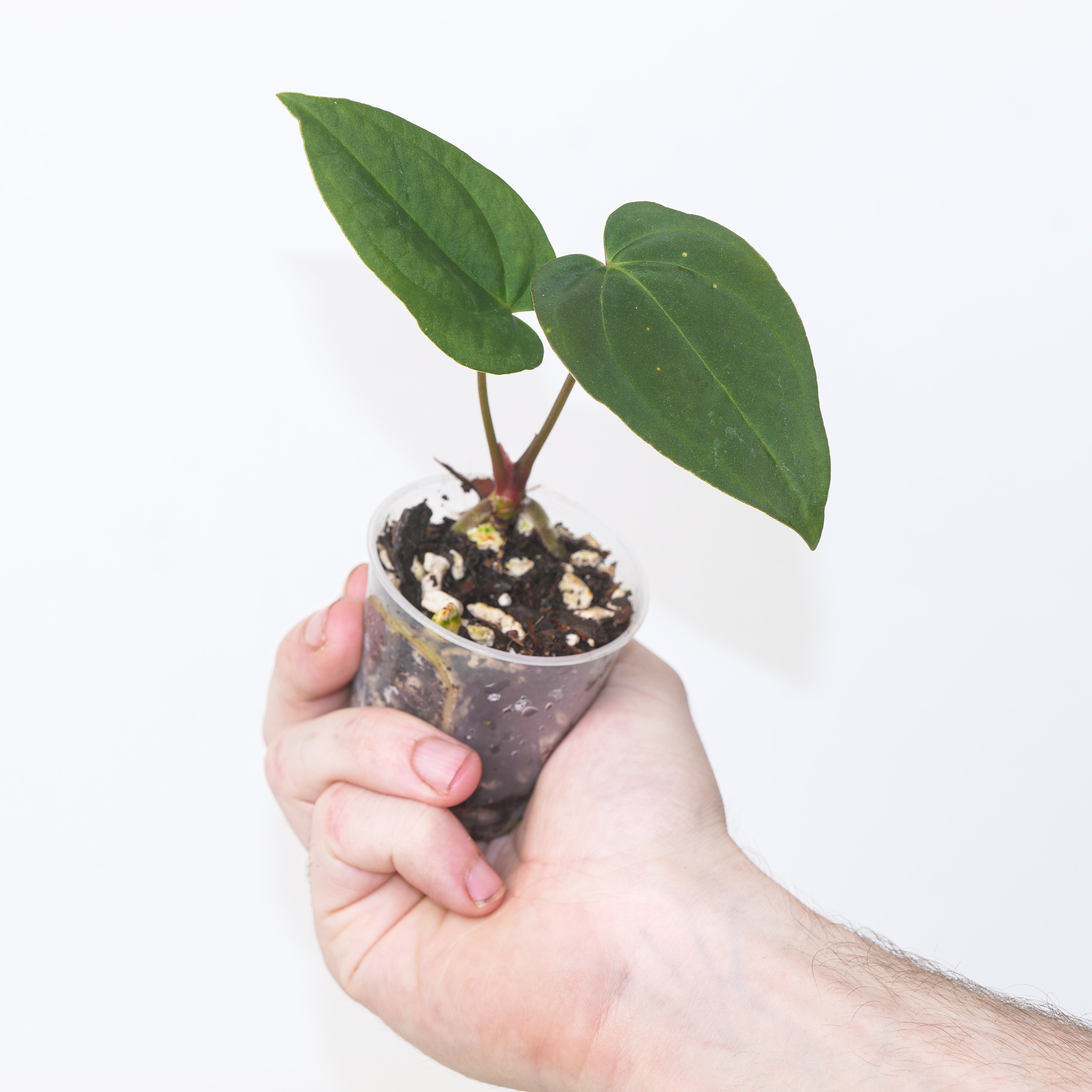 Anthurium ‘Red Spider’ × nigrolaminum ‘Gigi’ is a vietnamese hybrid between Anthurium 'Red Spider' and Anthurium nigrolaminum 'Gigi'. It is ane exciting cross that could combine characteristics of both: the closed sinus of Red Spider, with a dark, subglossy leaf of nigrolaminum
