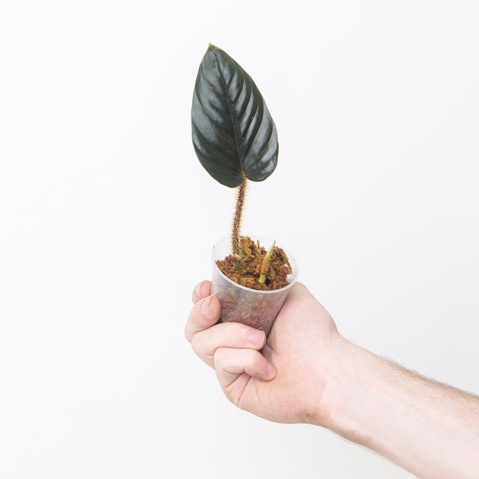 One for the collector - a very rare stunning species with shiny, almost-black adaxials and deep-red abaxials and petioles distinct from the similar plant we sell as Squamicaule cf. Ecuador.