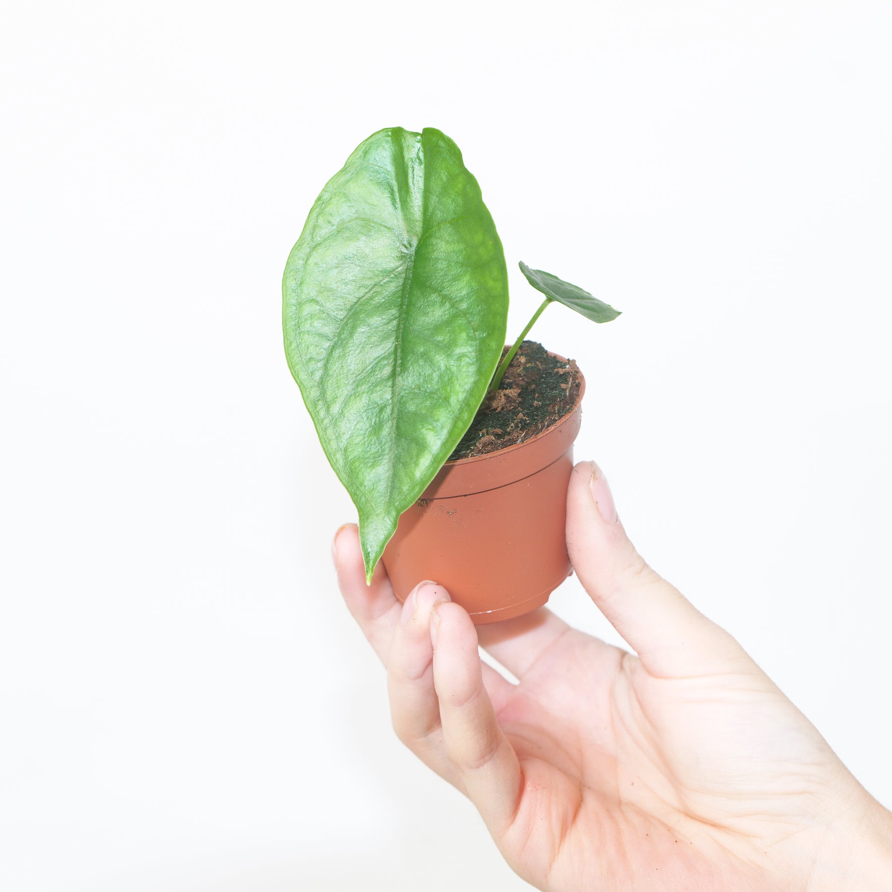 Alocasia heterophylla 'Dragon's Breath' is a rare and striking species known for its blue-silver, glaucous leaves that elongate and become pointed as they mature. This unique foliage makes it a highly desirable plant for collectors and indoor gardening enthusiasts alike. Its tuberous growth habit allows it to bush outwards, creating a dense and visually appealing display.