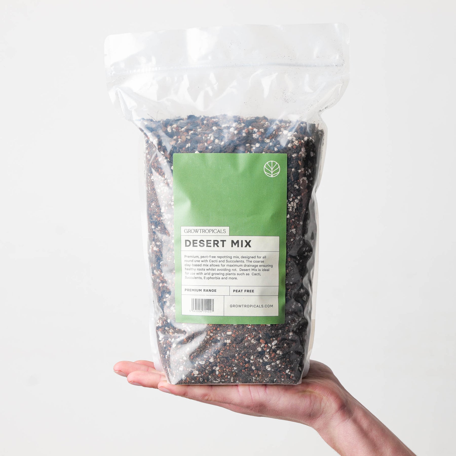 Desert Mix is a peat free potting mix designed for all round use with cacti and succulents. The light and airy substrate allow for maximum drainage with some water retention to ensure good root growth without root rot. It's composed primarily of calcined molar clay, fine bark, sand and pumice.