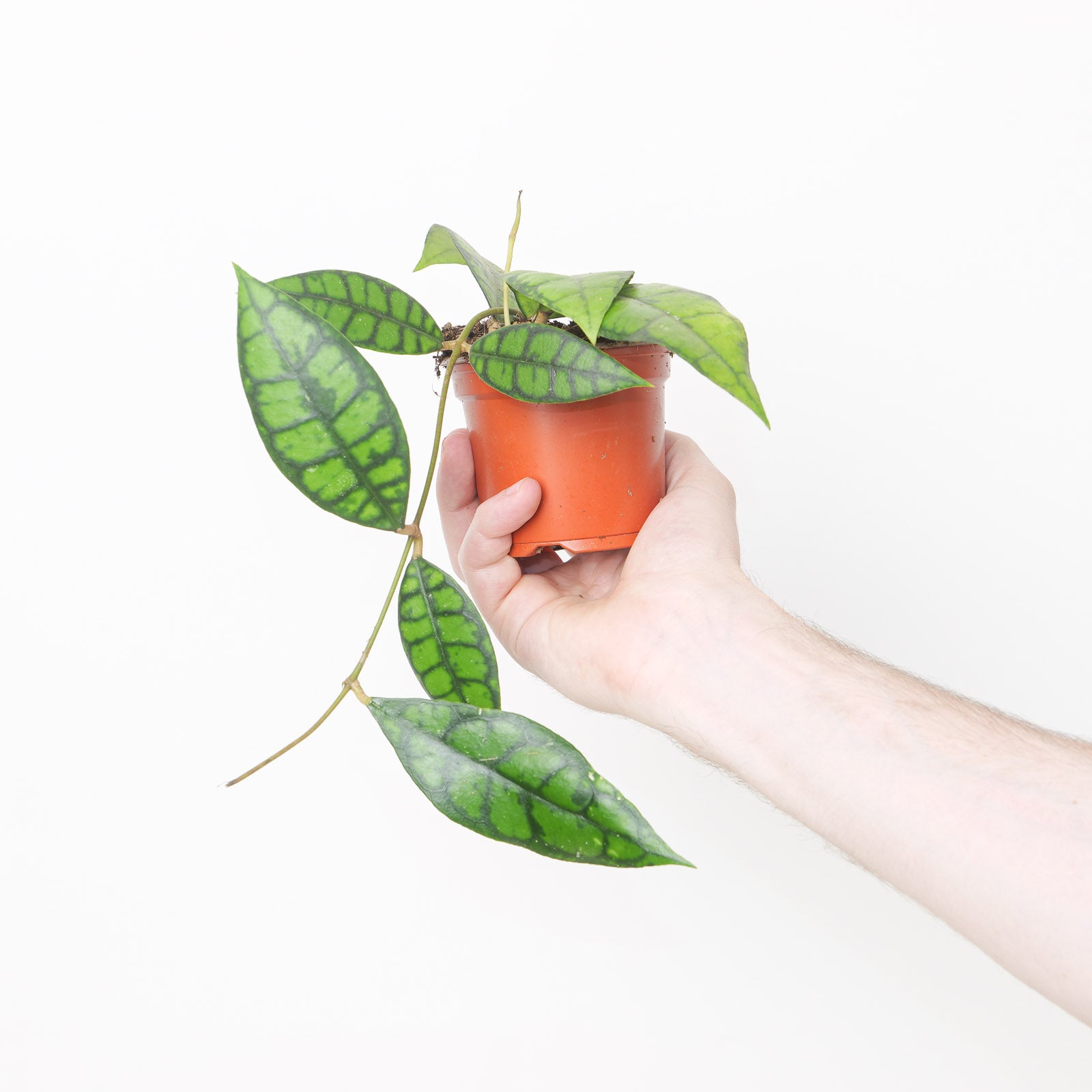 Hoya callistophylla ‘Black Cat’, a unique cultivar of Hoya callistophylla, is known for its striking green leaves with pronounced dark green, almost black veins that create a "vein bleed" effect. Originating from tropical regions in Southeast Asia, especially Thailand, this cultivar is a collector's favourite due to its dramatic foliage. As a trailing epiphyte, it does well when grown in hanging baskets or allowed to climb, which showcases its leaf patterns beautifully in bright indoor spaces.
