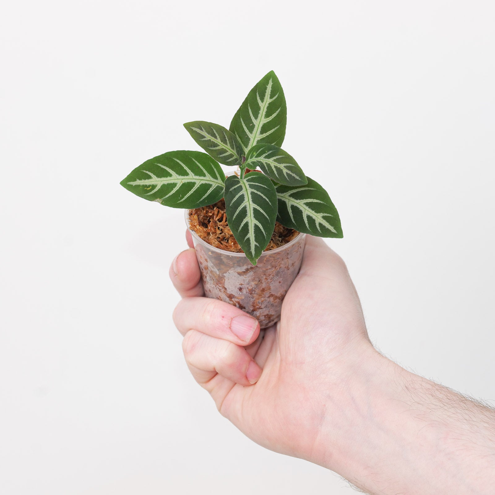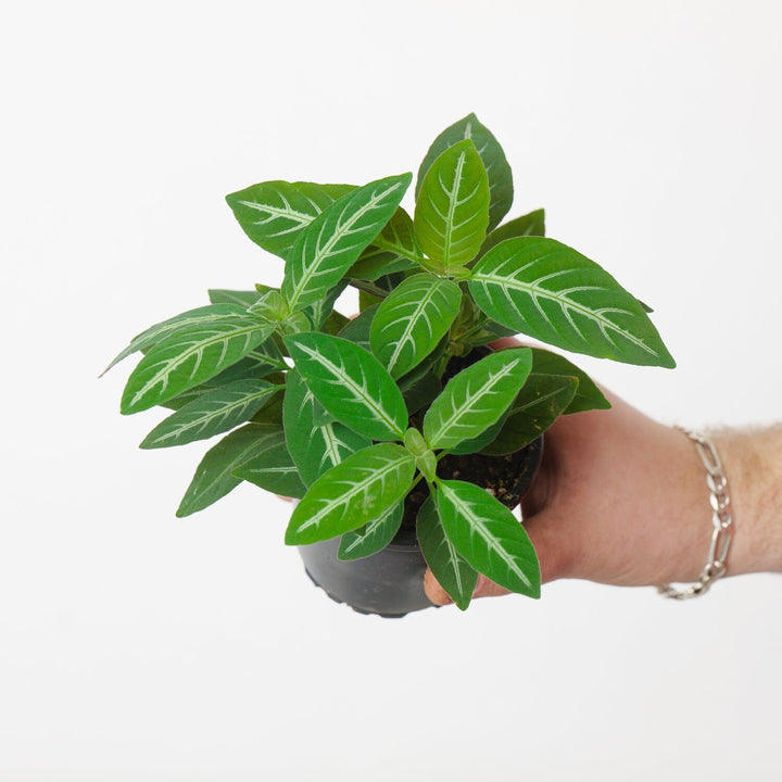 Ruellia makoyana, commonly known as the Monkey Plant or Trailing Velvet Plant, is a captivating evergreen perennial native to the coastal rainforests of southeastern Brazil. It thrives in the understory of the Mata Atlântica, where it benefits from warm, humid, and filtered light conditions. This species is cherished for its velvety, ovate leaves adorned with striking silvery-white veins and a purplish underside, complemented by tubular pink flowers that bloom primarily in winter and spring